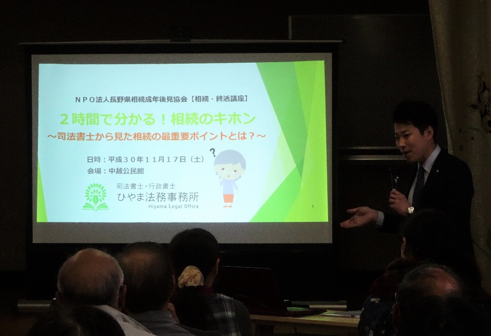 平成30年11月17日(土)中越公民館様にて、弊所代表が相続・終活セミナーの講演をいたしました。