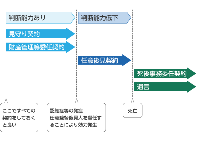 そこで、任意後見制度を補填する役割を持つ契約や遺言などを適切に組み合わせることにより、安心して老後を迎えられるようになります。