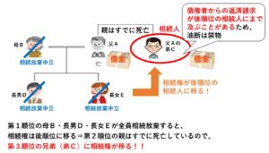 例えば、相続人が被相続人の配偶者と長男、次男であった場合、配偶者と子である長男、次男が相続放棄をすると、第1順位の相続人(子)がいないことになりますので(配偶者がいる場合、その配偶者は常に相続人となります)、第2順位の被相続人の父母など直系尊属に相続権が移ります。第2順位の相続人も全員相続放棄すると、次は第3順位の被相続人の兄弟姉妹に相続権が移ります。被相続人が高齢で既に兄弟姉妹も亡くなっている場合などは、代襲相続により被相続人の兄弟姉妹の子どもが相続人となり、借金の返済請求が被相続人の甥や姪にいくことも起こり得ます。