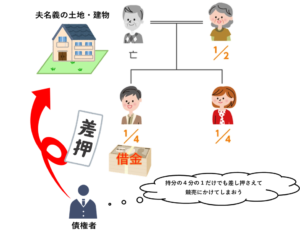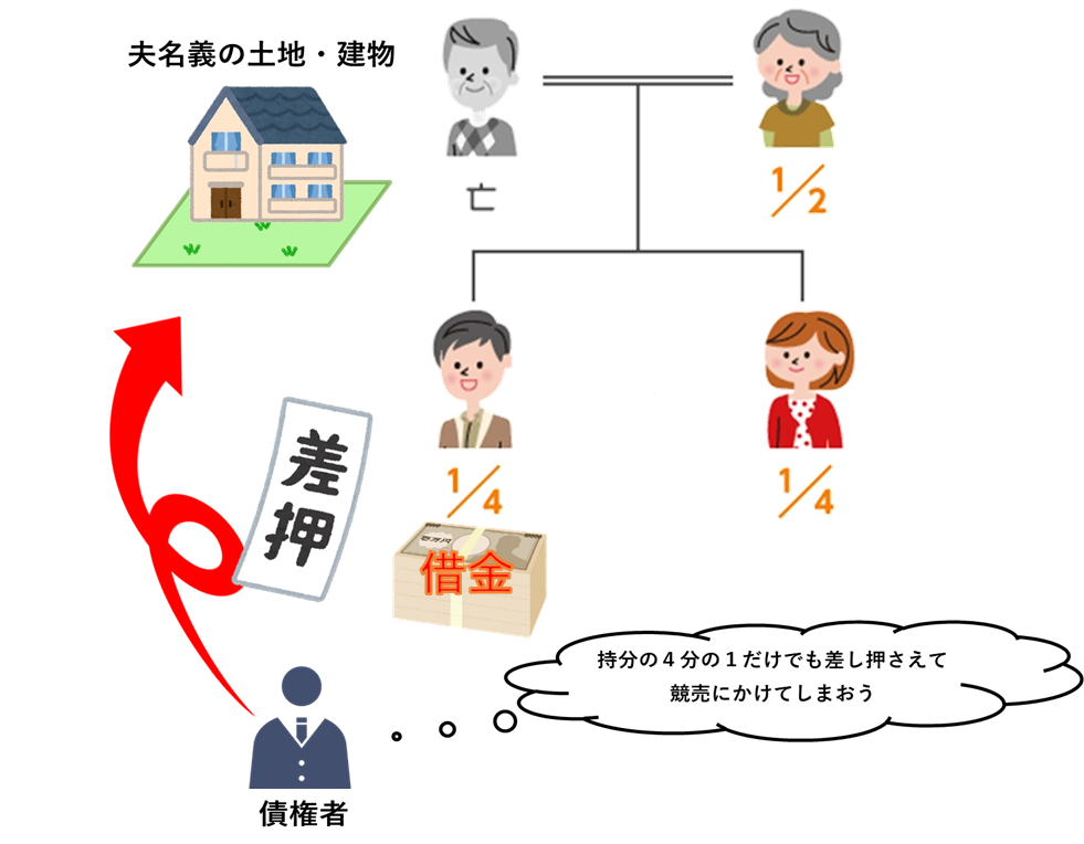 法定相続分どおりに登記するのであれば、他の相続人の同意がなくても相続人のうちの一人から相続登記ができてしまうので、相続人のうちの誰かが法定相続分の登記をして、自己の持分を勝手に第三者に売却してしまう事態も起こり得ます。 また、相続人のうちの一人に借金や税金の滞納がある場合、債権者が相続人に代わって法定相続分の登記をし、その相続人の持分を差し押さえることも起こり得ます。上記2つのケースで、既に遺産分割協議で他の相続人が単独で相続することになっていた場合でも、そのことを買主や債権者に主張することが難しくなってしまいます。