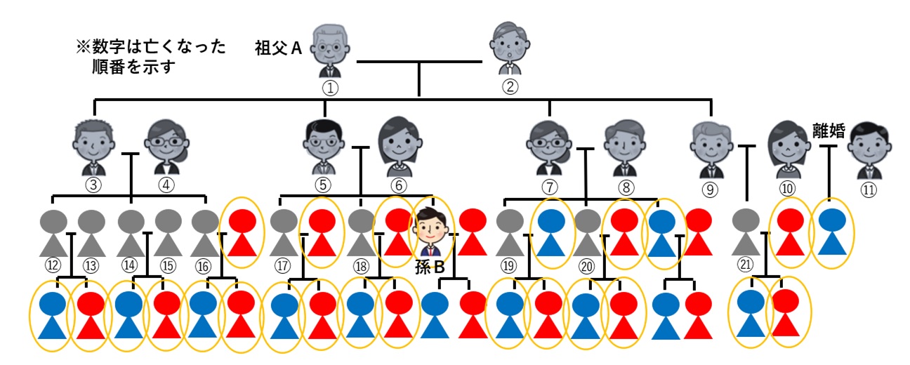 そもそもの話ですが、不動産は亡くなった方名義のままでは売却が出来ません。一旦不動産を相続した人の名義にしないと手続きができないのです。 そこで、Bさんは司法書士に依頼し、自分の名義にするため相続人の調査をしてもらったところ、なんとAさんの現在の相続人は25名であることが判明しました(下図参照)。これはAさんが亡くなってから何年も放置していたことが原因だったようで、Aさんの相続人であった人も亡くなり、その権利がそのまた相続人に引き継がれていくため、相続人の数が増えてしまったようです。中には会ったこともない相続人もいるようでした。Bさんは相続人全員と連絡を取り、全員から同意を得て書類に実印をもらわないと自分の名義にすることができません。