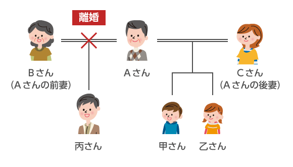 上の図のような場合、Aさんが亡くなると相続人はCさん、丙さん、甲さん、乙さんの4人となります。前妻の子と後妻との間では、ともすると感情的になりがちで、相続財産をめぐって争いが起こる可能性も非常に高いため、そうならないよう配慮の行き届いた遺言を残しておくべきでしょう。